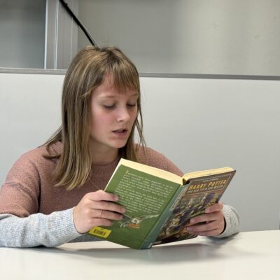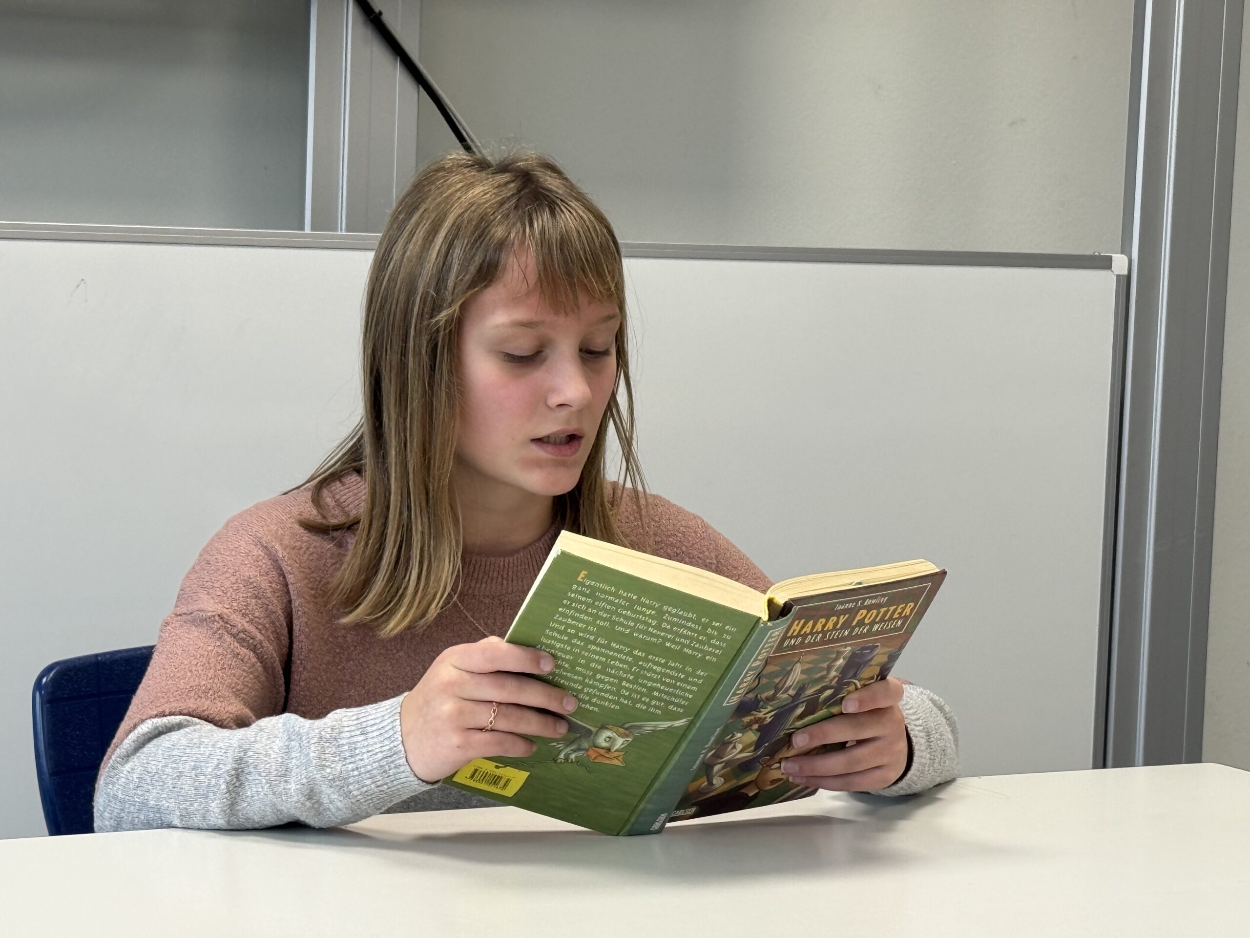 Danach wurde es gleich doppelt magisch: Zwei Schülerinnen hatten sich unabhängig voneinander für „Harry Potter und der Stein der Weisen“ entschieden. Hanna Weber (6b) entführte die Zuhörenden an den Bahnhof King’s Cross, wo Harry verzweifelt den richtigen Zug sucht und Hilfe von der Familie Weasley erhält. Ihre angenehme Klangfarbe und ruhige Ausstrahlung verliehen der Szene besondere Atmosphäre. Amelie Gerber (6c) wählte die Anfangsszene des Romans und beeindruckte mit kraftvoller Stimme und deutlicher Betonung.