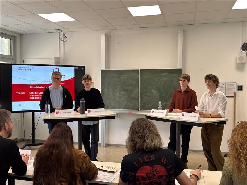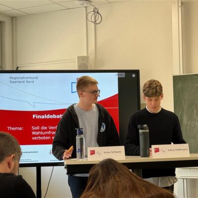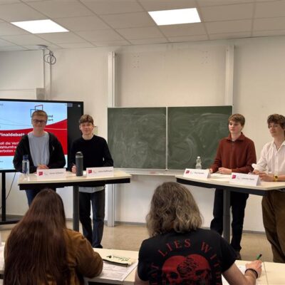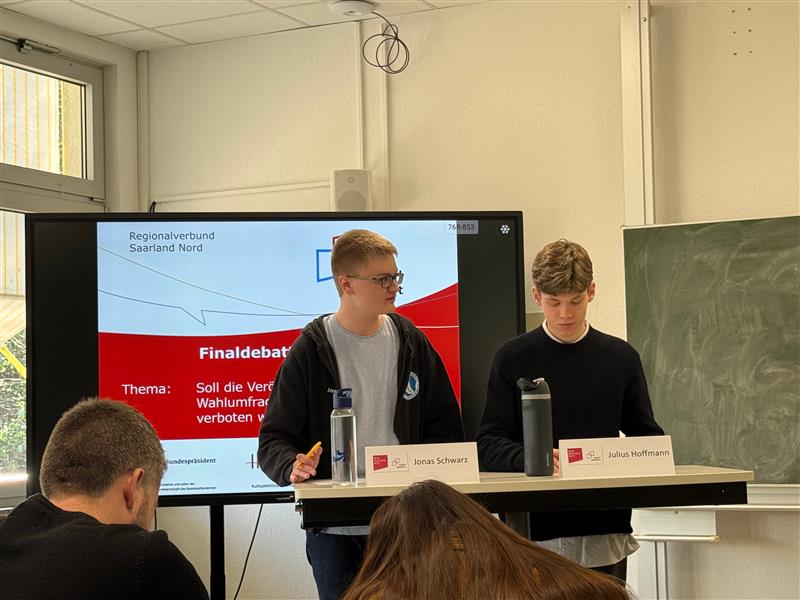 Im Mittelpunkt der Finaldebatte stand die aktuelle und gesellschaftlich relevante Fragestellung: „Soll die Veröffentlichung von Wahlfragen im Vorfeld von Wahlen verboten werden?“. Über dieses Thema debattierten Jonas Schwarz (Klassenstufe 12) und Julius Hoffmann (Klassenstufe 11) engagiert und auf hohem Niveau.