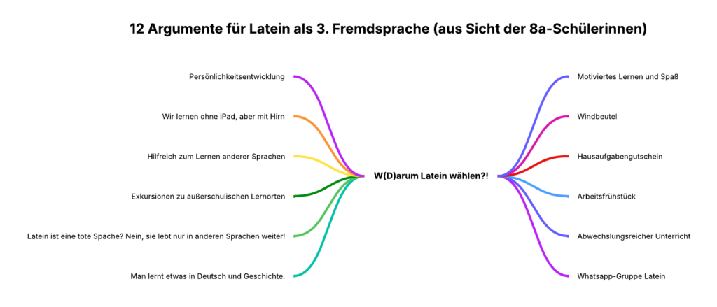 Das von manchen befürchtete Ende des Latein-Unterrichts hat sich bisher trotz der neuen zusätzlichen vierten Säule am Cusanus-Gymnasium St. Wendel, dem künstlerisch-musischen Zweig, nicht engekündigt, denn "Latein lebt auch in anderen Sprachen und Fächern weiter" (Original-Zitat Lateinklasse 8) und ergänzt diese ganz konkret, wie etwa Deutsch oder Französisch, Geschichte oder Religion, Kunst oder Ethik, Technik und Naturwissenschaft. Oder liefert - gepaart mit Wissen etwa aus Archäologie, Anthropologie und Neuro-Psychologie - Erkenntnisse über den Lehrplan hinaus zur europäischen Kultur, zu Lernoptimierung oder zur Antike-Rezeption bis zur Moderne.